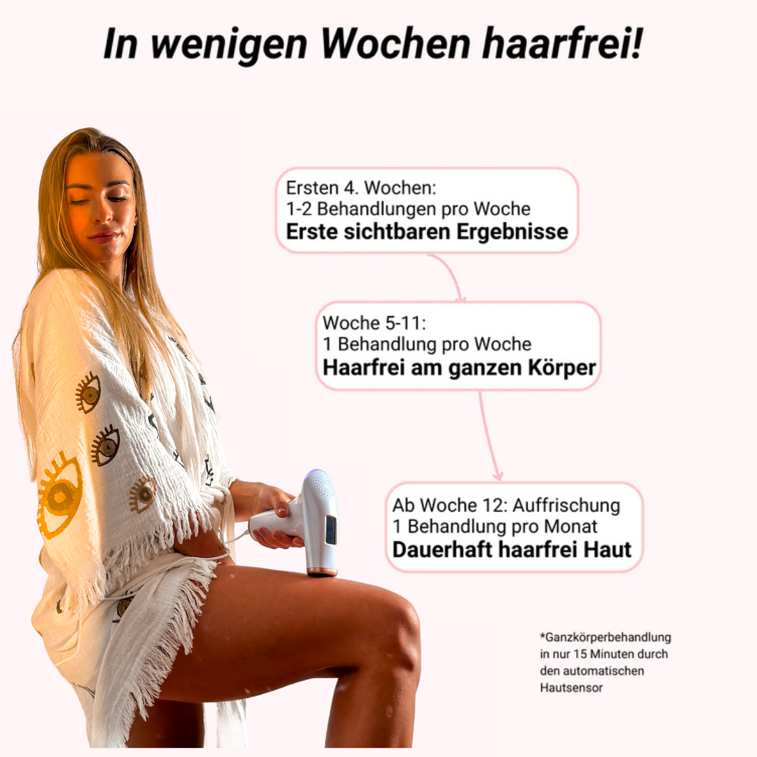 Nach der ersten Behandlungsphase bleiben die Ergebnisse monatelang sichtbar. Mit gelegentlichen Auffrischungen kannst du dauerhaft glatte, haarfreie Haut genießen.