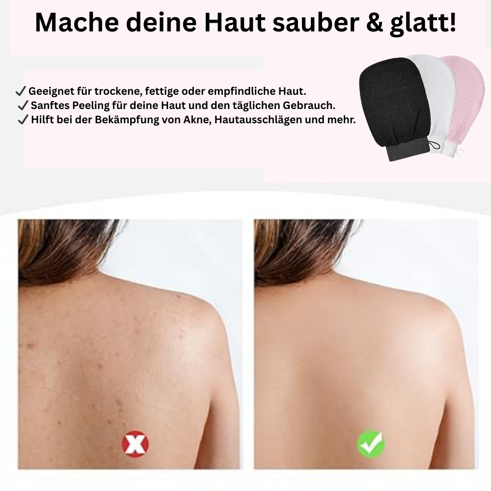 Die Anwendung ist angenehm und reizfrei. Der Peelinghandschuh entfernt abgestorbene Hautzellen schonend – ganz ohne aggressive Reibung. Kein Kratzen, kein Brennen, keine Irritationen – nur saubere, glatte Haut nach jeder Dusche.